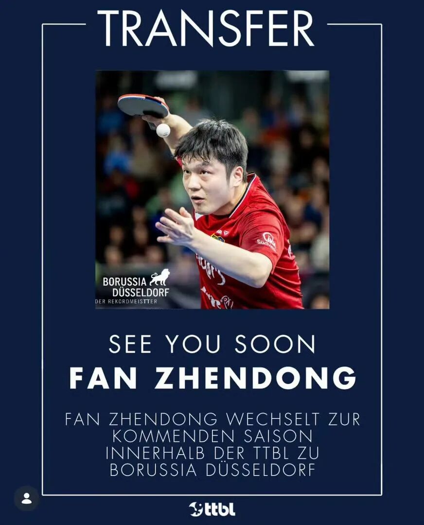 杜塞尔多夫官方写说念:“凭借签下中国超等巨星樊振东的重磅引援,杜塞尔多夫俱乐部将书写乒乓球历史新篇章。在听说球星波尔退役一年后,2024年奥运会男单冠军樊振东签下了26-27赛季的一年合约。”